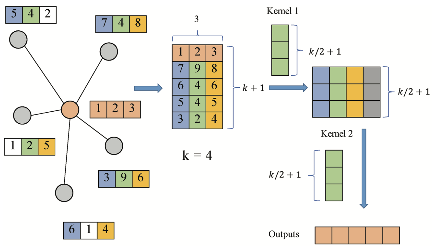 - After that, the embedding of the node $x$ is inserted into the first row of the matrix and finally get a matrix $\hat{M} \in \mathbb{R}^{(k+1)\times c}$